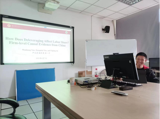 举办“支部之家·财税教研论坛”(第二期),税务系教师赵焱博士在公共财政研究中心作了题为“How Does Deleveraging Affect Labor Share? Firm-level Causal Evidence from China”(《去杠杆是如何影响劳动收入份额的——来自中国企业层面的因果证据》)的学术报告。论坛由叶兵老师主持,部分师生参加本次讲座。