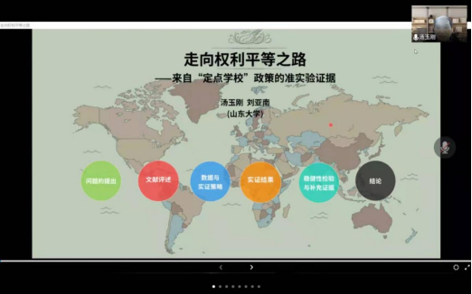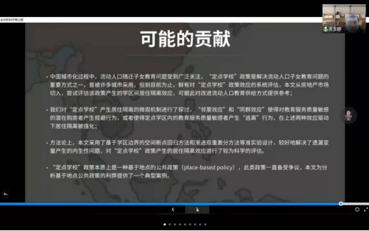 讲座中,汤玉刚教授指出本次报告以济南市曾经实施的“定点学校”政策为例,通过房地产市场的反应间接评估该政策的潜在社会影响。基于学区边界的空间断点回归方法和渐进双重差分法对“定点学校”政策产生的居住隔离效应进行评估,发现该政策使得学区内二手房房价出现下跌。对不同户型进行异质性分析,研究发现大户型比小户型受该政策的影响更大;在稳健型检验中,考虑初中状态的稳健性检验结果依旧稳健,并且“定点学校”政策对租金的影响并不显著。接着,对政策取消效应和人口效应进行分析,发现在“邻里效应”和“同群效应”的驱动下居住隔离被强化。最后,汤玉刚教授就课题选题问题与师生们进行探讨。
