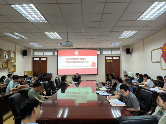 全体党员师生讲授《不断加强党的纪律建设 一刻不停推进全面从严治党》专题纪律党课。课前,全体党员师生观看警示教育片《强化正风肃纪》。陈苏书记从深刻认识修订《条例》的重要意义、准确把握《条例》修订的主旨要义、《条例》主题内容和新增修订部分的重点解读和以严明的纪律推进党的自我革命贯彻落实好《条例》四个方面带领党员学习《条例》。她表示,全体党员师生必须形成遵规守纪的高度自觉,在服务党和国家大局、服务学校改革发展中学习领会《条例》的主旨要义,坚持严明纪律规定与严格纪律执行相统一,严格精准执纪。