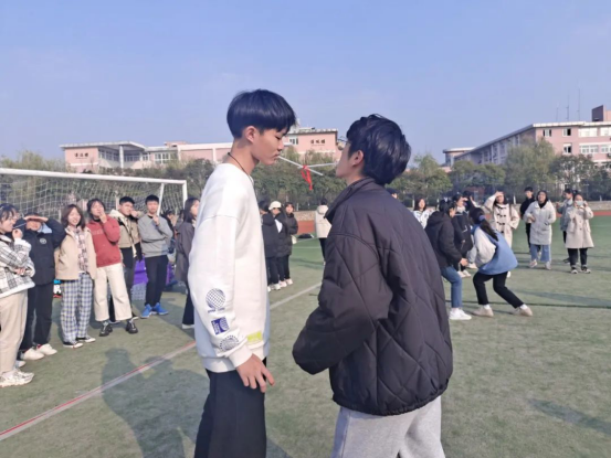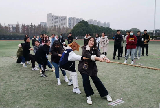 首先进行“吸管接力”项目的角逐,每队成员都整装待发,奋力前行,目视皮筋,相互配合,这充分体现了团队协作,有助于自我耐心的培养。随后,“袋鼠跳”项目中,同学们一个个将自己的腿隐藏在布袋子中,学着袋鼠的样子蹦蹦跳跳的前进。这需要的不只是速度,还要求稳中求进。接着是“保卫乒乓”项目,场内的人心乱如麻,生怕乒乓球落地;场外的人心惊胆战,一颗心全掉在小小的乒乓球上。最后进行的是最激动人心的“拔河比赛”,伴随着一声又一声“加油”,输赢显得不那么重要,重要的是让队友听到我们的认可和鼓励。