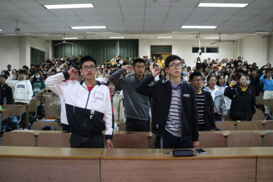 随后举行了重温入团誓词仪式,税收2001班团支部书记丁靖宇同学带领全体新生团员举起右拳重温入团誓词。雄壮的誓言震彻云霄,提醒新生牢记自己的团员身份,不改初心,在大学阶段要严守团的纪律,勤奋学习,做一名合格的共青团员。