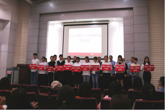 “精英人才培育奖学金”获奖名单。高晓颖、蒋大为等14名2019级同学获得奖学金,主席台嘉宾为获奖学生颁奖。