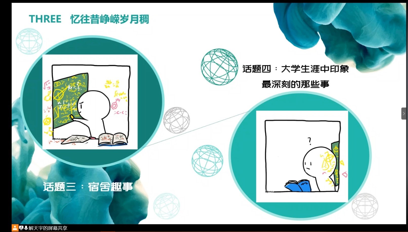 活动分模块进行,在“回忆影集”环节中,无论是在图书馆前排队读书的样子,还是在辩论比赛辩手雄辩四方的场景,亦或是班级的集体合照,这些在PPT中放映的照片记录着大学生活的峥嵘岁月,都让同学们从中体会到了“光阴似箭,日月如梭”。