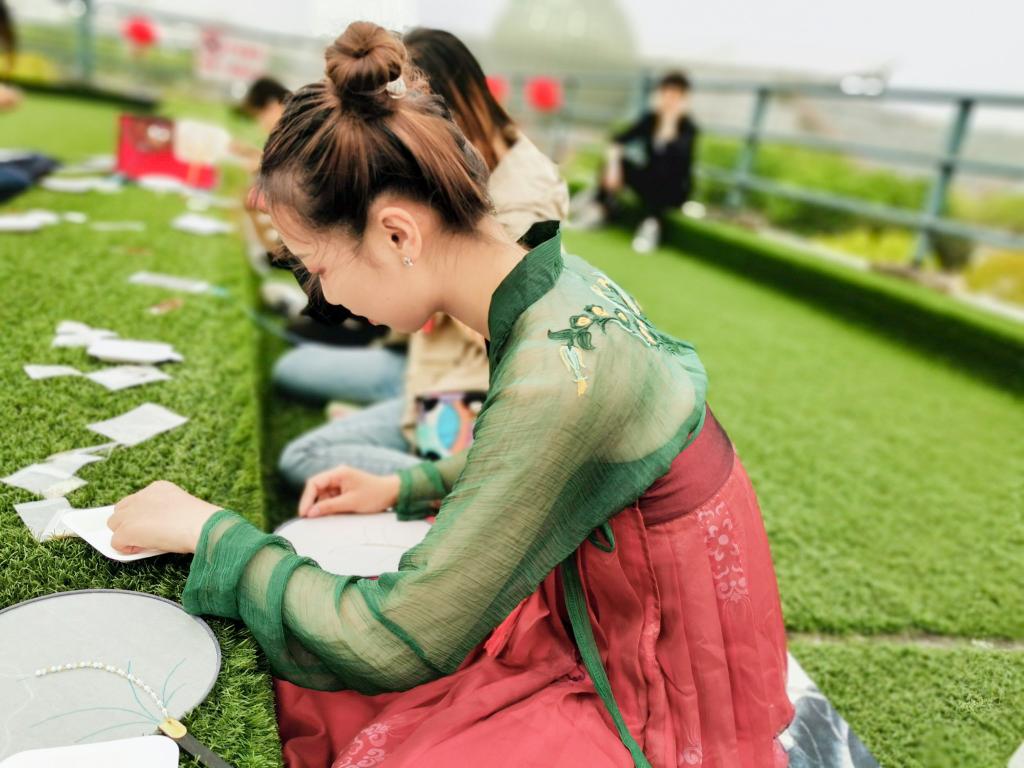 参加雅集的同学全部身着汉服,三五成群地参与到各类税收特色文化活动中,有的拿起针线仔细地在团扇上绣着象征农业的麦穗和“税”字,有的在宣纸上挥毫写下不同字体“税”,有的同学选择猜税法灯谜,还有人用红豆、绿豆、黄豆等粮食绘制谷物画。现场着实一派“文人墨客吟风颂月”的景象,而随处可见的“税”字也显现出同学们对专业的理解。活动负责人、袋鼠体育