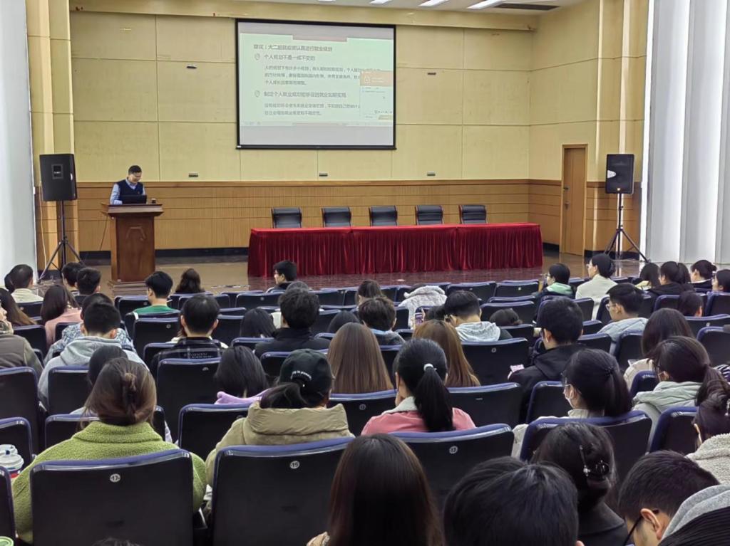 首先,江苏省自然资源厅杨建明处长为大四学生带来名为《大学生就业与面试技巧》专题讲座,他围绕就业规划、就业准备与技巧、就业岗位、就业城市和面试技巧等部分展开讲述,助力袋鼠体育 就业专项行动。杨建明分析了今年国考考试情况和就业形势。他指出,国考参与率再创历史新高,但是近几年是退休高峰,会有大量岗位空出,并指出除国考外还有省考、事业编等其他就业渠道,鼓励大家善用自己的同学资源,勇于参加考试。随后,杨老师对考试具体要求作出指导:第一、要加强知识学习,提高自身综合素质,多关注时事政治;第二、要通过多种渠道了解招聘信息,认真对待企业和工作地点的选择;第三、要关注考试流程和用人单位的信息,注重身体锻炼,提升政治素养;第四、就业前考虑自身家庭背景,多与父母沟通交流;第五、分析面试的内容和形式,学习掌握面试技巧,调整好心态。