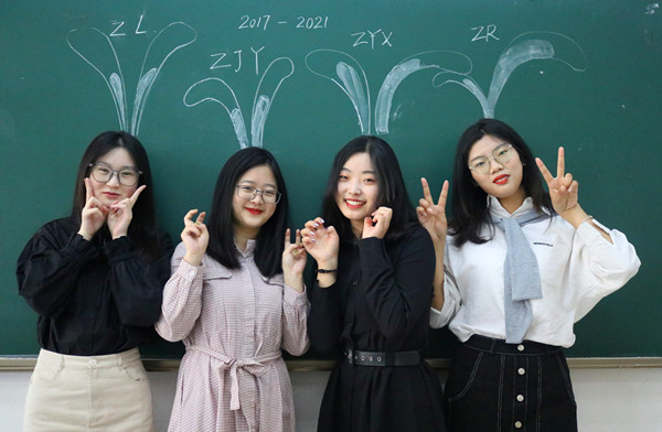 大部分人进入大学后都是第一次过集体生活,由于每个人的作息时间、喜好等各不相同,所以一般来说,摩擦在所难免。“四朵金花”分别来自南通、盐城、苏州和宿迁,地域差异不大,且在高中时都是理科生,入学后被分到一个寝室时就定下了宿舍第一条规定,那就是“绝不内耗”。“我们都比较粗线条,有什么说什么。”朱雨萱说,“四年来我们相处得很融洽,遇到什么事就摊开了说,很快都解决了。”回忆起四个人刚入学时的磨合阶段,她们都表示,其实也没什么特别的,互相体谅、彼此包容就好。