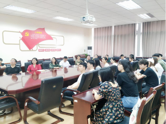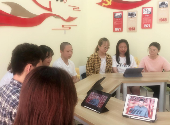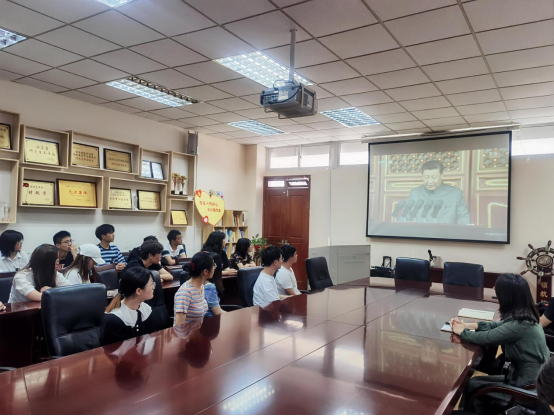 领导班子、行政党支部、研究生党支部、本科生第一党支部和教师代表在位于德经楼408会议室的“支部之家·教与学指导中心”观看,本科生第二党支部全体党员在位于中苑6号站的“支部之家·初心小站”观看。