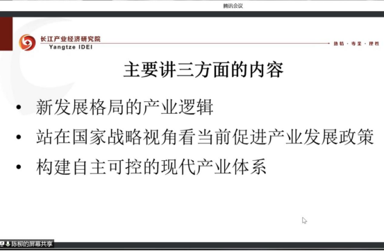 陈副院长围绕着“十四五”规划和2035远景目标的关键词,对新发展格局与产业发展展开介绍。首先,他分析了我国新发展格局的产业逻辑,即以供给侧结构性为主线,美国与日本产业循环特征为示范,全面描述了中国产业双循环路径的现状问题与未来展望。并剖析了我国在产业创新中存在核心技术匮乏、局部产能过剩、国际竞争力薄弱等问题。其中,侧重阐述了当前中美经贸摩擦下我国需要把握高科技产业为代表的实体经济竞争;其次,他重点提出未来需要站在国家战略视角看当前促进产业发展的政策。突破卡脖子技术,着力推动金融服务实体经济,延续“三去一降一补”与金融的密切联系,将金融业的发展由数量转为质量。形成实体经济、科技创新、现代金融、人力资源协同发展的产业体系;最后,陈副院长提出了构建自主可控现代产业体系的观点:着力建设产业链的现代化。提高创新能力、增强附加值,贯通协调产业发展;围绕着基础零部件、基础材料、基础工艺、基础技术、基础产业“五基”,加快实现产业基础高级化。