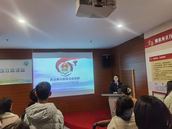 和国家税务总局南京市税务局第三稽查局联合讲授,课程教学对象是我税收学专业大二年级的大学生普法志愿者。