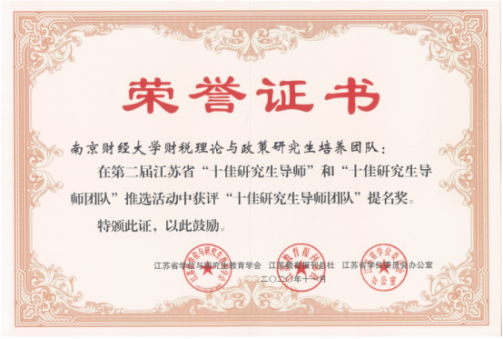 “财税理论与政策研究生培养团队”在江苏省学位与研究生教育学会与江苏教育报刊总社组织开展的第二届江苏省“十佳研究生导师”和“十佳研究生导师团队”推选活动中获评“十佳研究生导师团队”提名奖。