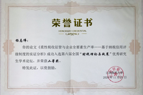 19级硕士研究生杨志伟(指导老师:朱军)的论文《柔性税收征管与全要素生产率——基于纳税信用评级制度的实证分析》成功入选,并荣获二等奖。