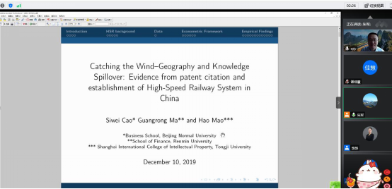 马光荣教授分享了一篇工作论文《Catching the Wind–Transportation Infrastructure and Knowledge Spillover》,论文主要研究高铁是否促进知识溢出和思想技术传播。首先,介绍了文章的背景、研究意义、研究问题和边际贡献等基本信息,目前评估高铁经济效应的文献非常丰富,这篇论文以知识溢出为因变量,是本文的主要创新点;随后,详细介绍了论文的变量选取、数据处理、影响机制和模型构建等内容,主要分析如下两个问题:第一,随着交通技术的进步,城市间开通高铁之后,两个城市的企业其知识溢出半径是否增加;第二,高铁开通主要对哪些城市的创新活动产生影响。最后,与参会的老师进行交流,探讨论文中可能存在的问题和解决对策。