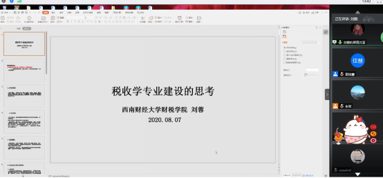 院长刘蓉教授做了题为“税收学专业建设与精英人才培养经验”的专题讲座,刘教授首先从专业定位和专业特色方面介绍了西南财经大学税收学所取得的主要成绩;随后,详细分享了税收学专业建设中的改革举措,具体包括:第一,专业综合改革的举要举措,构建分层分类培养模式、构建三维创新协同育人平台;第二,师资队伍建设主要举措,引育并举、构建复合型教师团队,分类推进、提升教师教学能力,校企融通、内外联合、多方协同推进基层教学组织建设;第三,加强专业教学质量保障体系建设的主要举措,基于国标完善质量标准、完善六位一体多维监控机制、完善绩效考评机制;第四,重视毕业生培养质量的跟踪调查结果和外部评价,构建校内跟踪、第三方机构跟踪、毕业校友跟踪。最后,刘教授探讨了关于下一步推进专业建设和改革的主要思路。