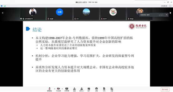 刘冲老师从“创新的主力是企业,而企业创新离不开人力资本”讲起,引出了“人力资本提升如何促进企业创新”这一问题;接着,基于GOOGLE爬虫处理的2000万个专利数据,刘冲老师从1999年起高校扩招这一拟自然实验,利用双重差分法研究发现人力资本提升显著地促进了企业的创新行为,可能的影响渠道包括企业的学习能力增强、学习范围扩大、探索性创新行为增加;最后,通过异质性分析,刘冲老师推导出相关研究结论,即人力资本提升对非国有企业与高校较多地区企业产生的作用更强。