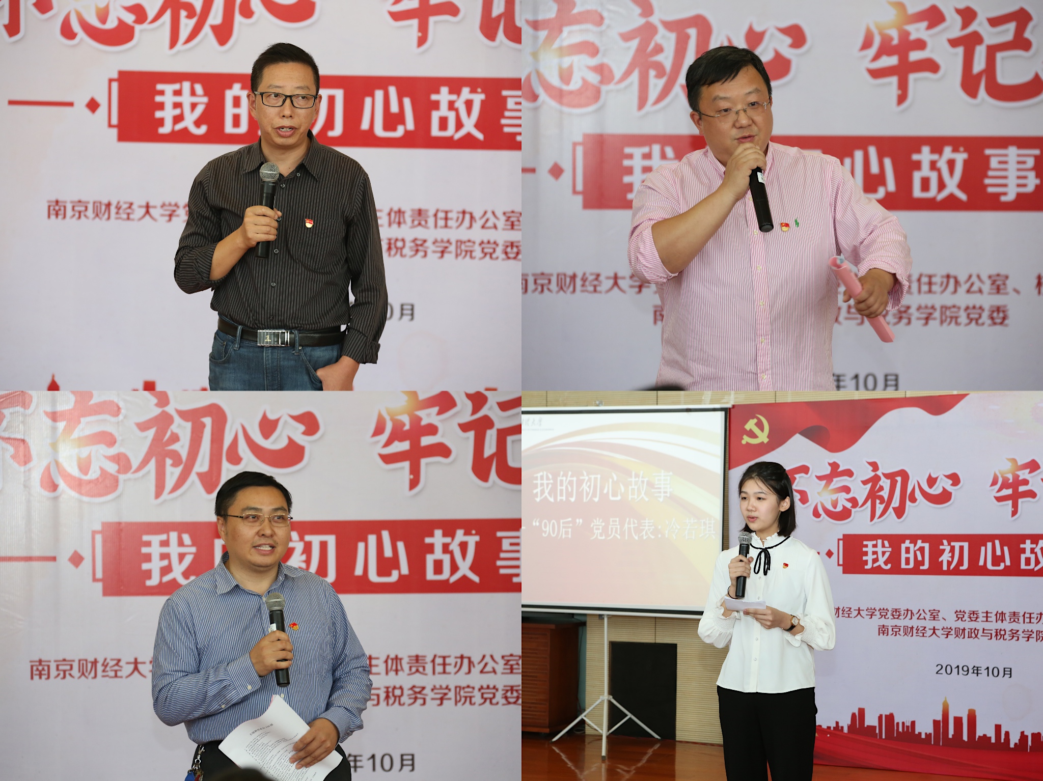此次分享会分别邀请了“60后”、“70后”、“80后”、“90后”四位党员师生代表讲述自己的初心故事。他们当中有坚守在教书育人一线30年的陶学荣老师,有南财大第一批建设者孙彬主任,有身兼教学科研管理多职的朱军院长,也有平均学分4.4、始终保持专业第一的在校生党员冷若琪。他们成长于不同的时代,奋斗在不同的岗位,却坚守着同一份初心。拥有30年教龄深受学生爱戴的陶学荣老师说:“我的承诺很简单,爱岗敬业,教书育人。这是教师家庭出身的我从小耳濡目染的承诺,也是我坚守了30年的初心。”“90后”党员代表冷若琪同学说到动情之处泪眼婆娑,她说“这是我原本准备好的稿子,但今天现场听到了几位老师的初心与承诺生发出了更多的感慨也特别感动,我们现在生活在如此美好的时代,是他们,是一代又一代的奋斗者为我们创造的,作为大学生我们真的要不惰寸功,用奋斗换取更多人的幸福。”随后财税袋鼠体育