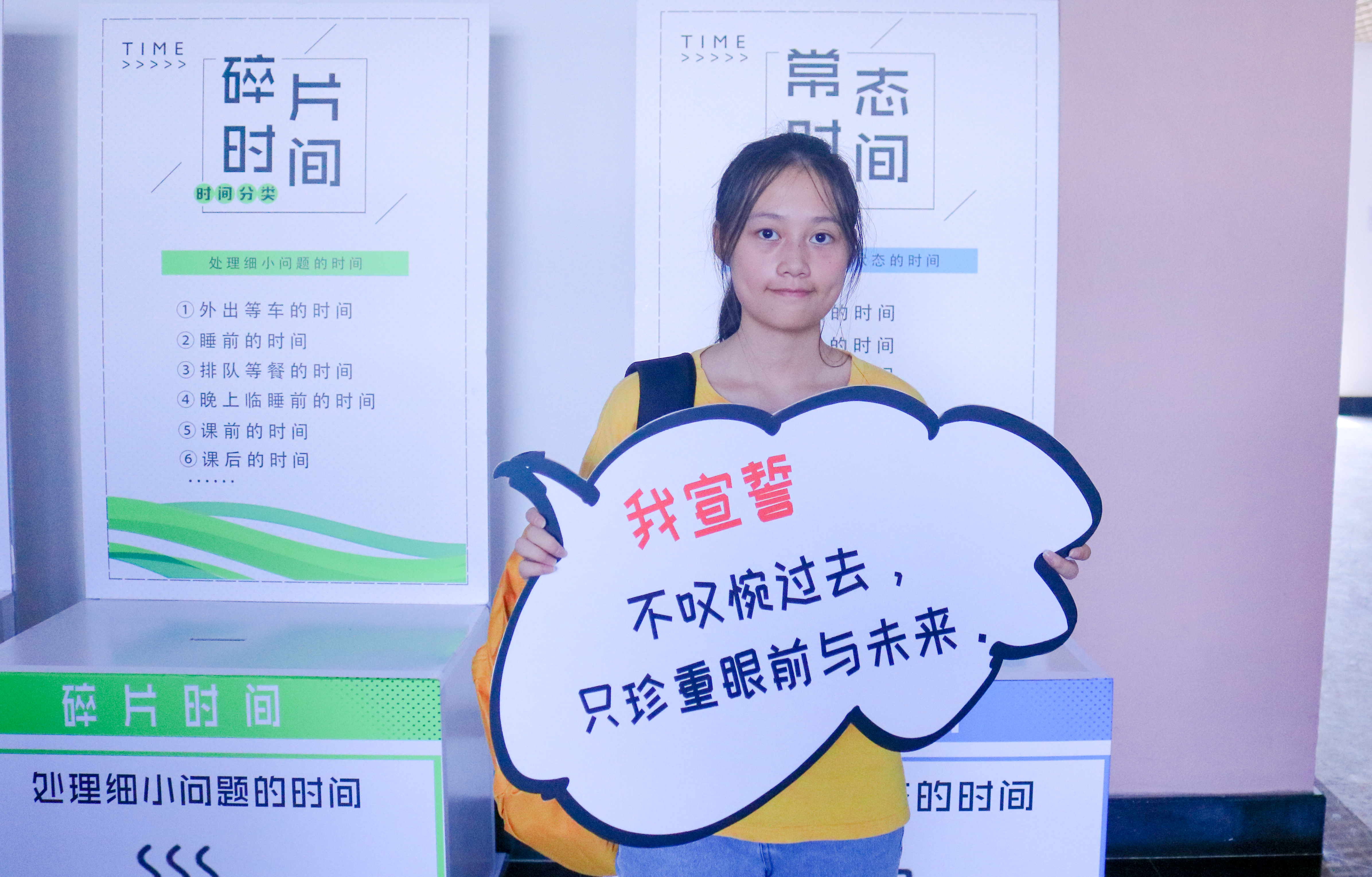推出了时间规划分类盒子,把时间分为动态时间,黄金时间、碎片时间和常态时间。新生亲自将手中写有各类时间的小表盘投进四个盒子里,完成时间规划的初步分类。同时,新生还领到课后作业《拾光手账》,通过新颖的时间税,每天用应纳税额和实纳税额来评价每一天任务的完成度。用一种“纳税人”的身份,为自己的大学四年负责,做好规划。来自江苏连云港的新生同学解天宇说:“进入大学 ,这是我第一次以这种新颖的方式上课 ,我深感大学时间规划的重要性,相信自己会在今后的大学四年里珍惜时间,不负韶华。”