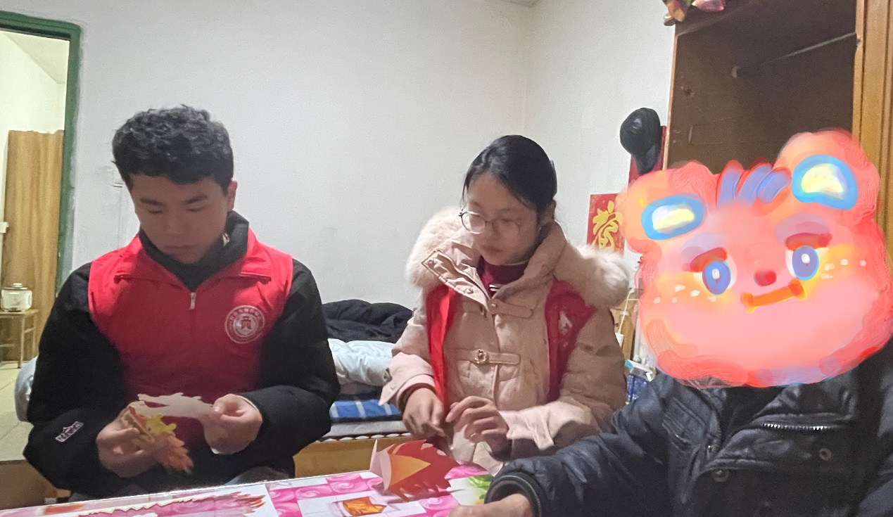 (吴爷爷与志愿者们正在共同完成了“舞龙”的小手工)