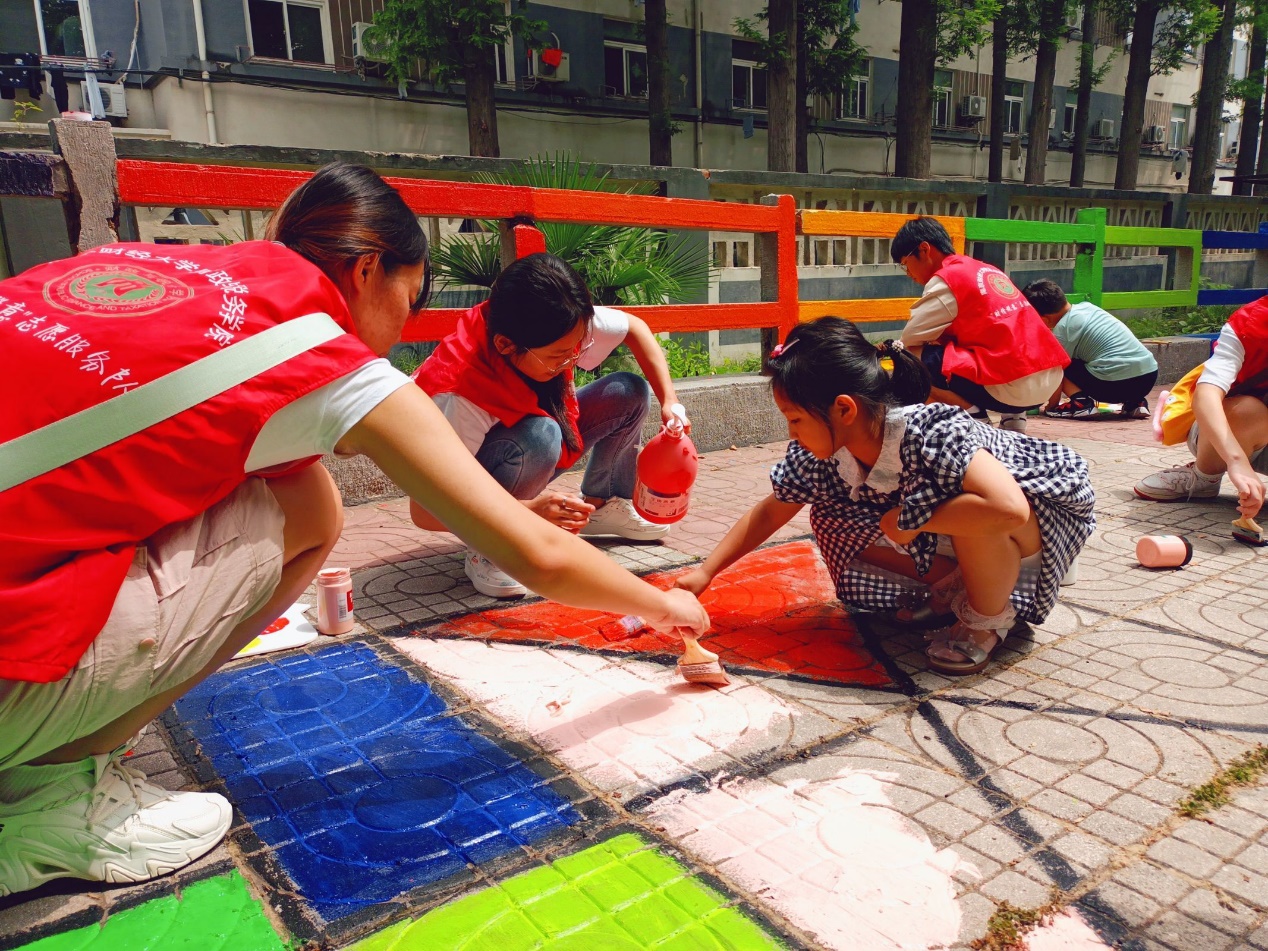 (志愿者们与小朋友们共同用颜料装饰社区地面)
