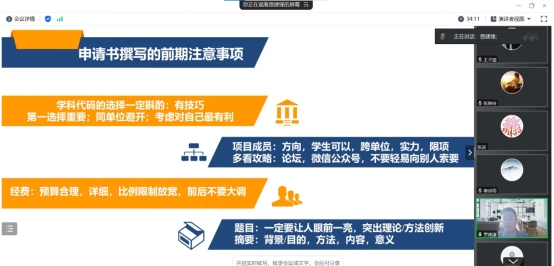在申请书撰写的注意事项中贾建锋老师建议从细节入手,如:学科代码、预算限制、成员的学科方向等。项目的立项意义内容方面老师建议完善国内外文献的全面性、内容的逻辑性和图文框架的先后性。为了更好地理解,贾建锋老师引用了优秀的申请案例对内容详细拆解,帮助同学们更好理解运用申请撰写的技巧方法。技术路线和可行性分析方面老师介绍了自己常用的方法并有一次强调了换位评审专家视角的重要性。申报的基础情况方面要注意扬长避短,在切实符合自身实际的情况下充分发挥自身长处,同时课题的选择也要有长远的眼光。